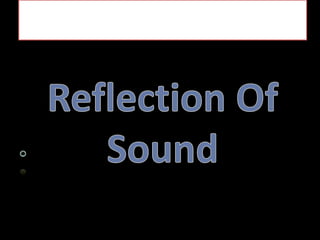 The document discusses reflection of sound and how various devices use reflection of sound waves. It defines reflection of sound as sound bouncing back when it strikes a hard surface. It describes how a megaphone amplifies and directs sound by reflecting it, a stethoscope is used by doctors to listen to body sounds by reflecting them, and a soundboard in a large hall reflects sound to aid listening. Echoes occur when a sound reflects off a surface and the original sound and reflection can be heard separately if there is a time interval of at least one tenth of a second between them.