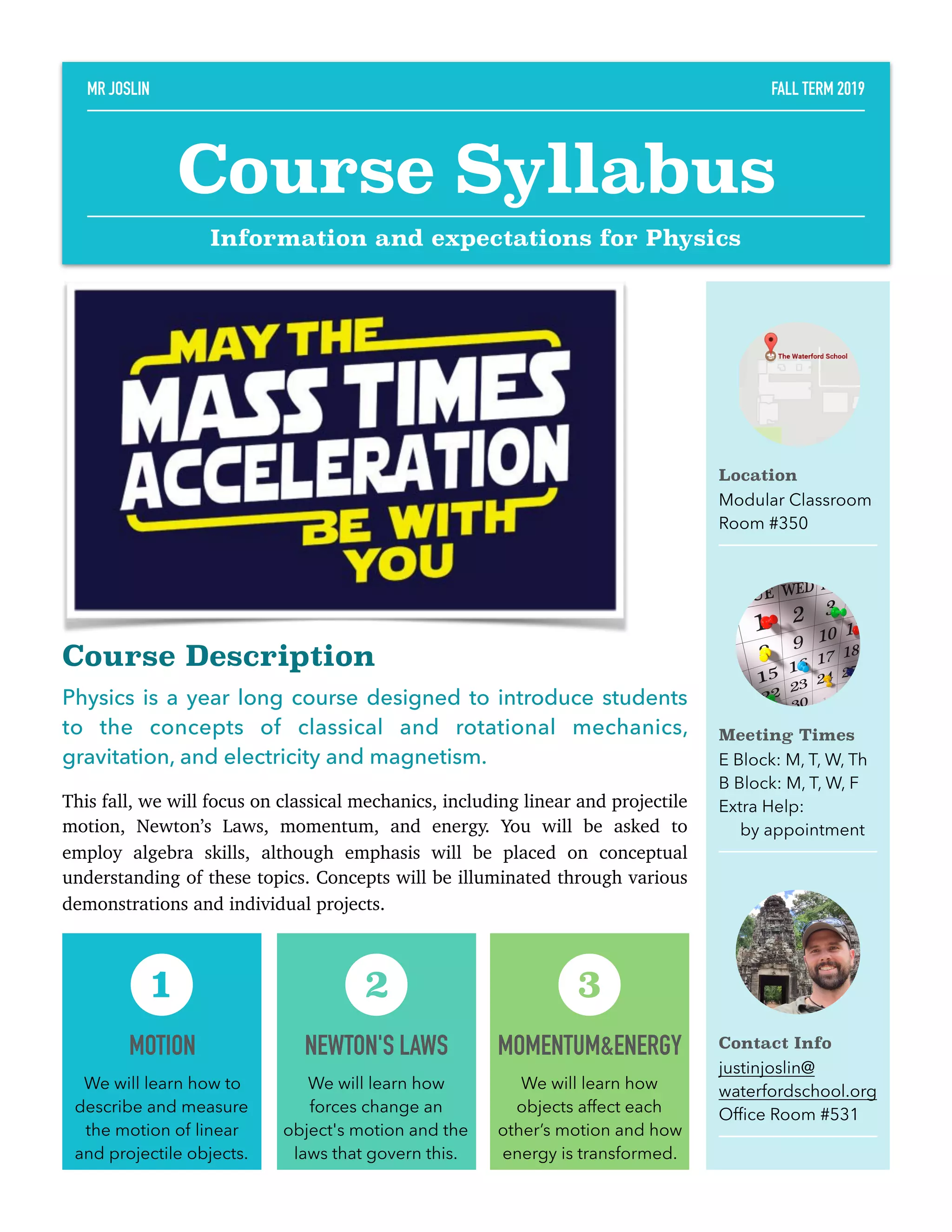 - The course covers classical mechanics, gravitation, and electricity and magnetism over the school year. This term will focus on concepts like motion, forces, momentum, and energy.