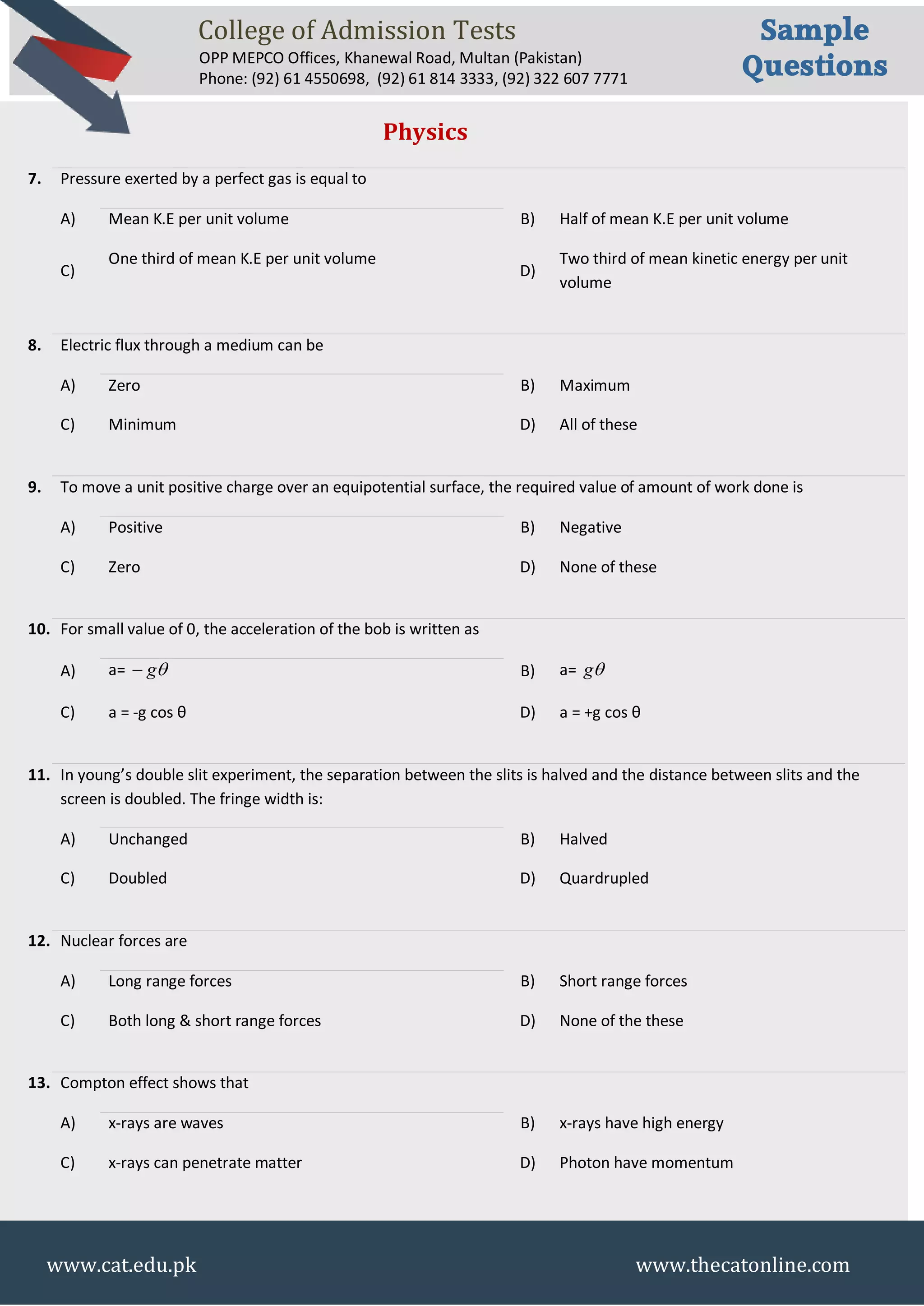 The document provides a set of sample physics questions for a college admission test, including multiple-choice questions covering various topics in physics. Each question has four response options, and correct answers are listed at the end of the document. Contact information and links to related websites are also provided.