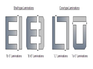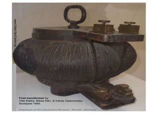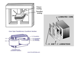 The document discusses transformers, including their structure, working principle, construction, losses, and applications. A transformer is a device that transfers electrical energy between two circuits through electromagnetic induction. It consists of two coils, a primary and secondary winding, wrapped around an iron core. When alternating current flows through the primary, it induces a magnetic field that transfers energy to the secondary coil without direct electrical connection, inducing voltage in the secondary. Transformers are used widely in power transmission and distribution to change voltage levels for efficient transmission or usage. They allow flexible adaptation of voltage for different applications while maintaining frequency.
