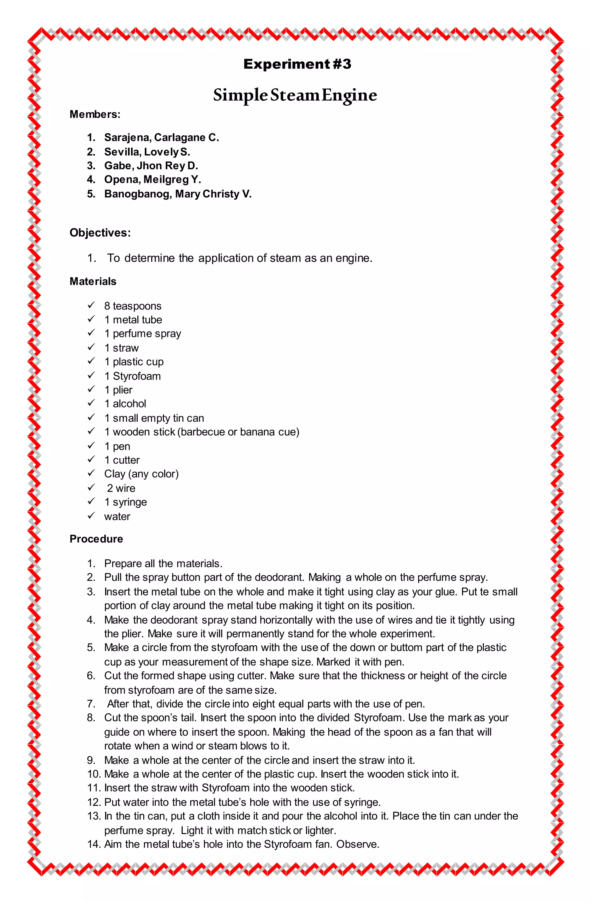 1. The document describes an experiment conducted by 5 students to determine the application of steam as an engine.