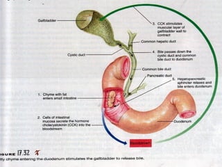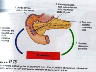 The document discusses pancreatic secretions and their regulation. The pancreas secretes digestive enzymes like lipase, amylase, and proteases in inactive forms. Trypsinogen is activated to trypsin in the small intestine by enterokinase. Pancreatic secretions are regulated by vagus nerves, cholecystokinin (CCK), and secretin. CCK stimulates enzyme secretion while secretin stimulates bicarbonate secretion. Bile is also discussed, including its role in fat digestion, composition, and enterohepatic circulation of bile salts. Secretions of the small intestine, including enzymes on the brush border, are also summarized briefly.