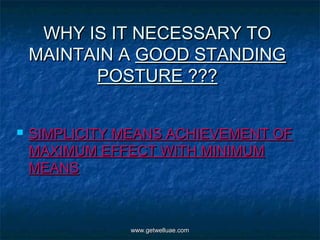 The document discusses the importance of maintaining good posture while standing. It notes that poor posture can contribute to back and neck problems over time. It provides examples of bad posture habits like slouching or carrying heavy items unevenly. The effects of bad posture are described as muscle imbalances, pain, joint issues, and reduced work performance. The document recommends exercises and stretches that can be done at the desk like calf raises, leg balances, and tricep presses to improve posture. Tips for good standing and walking posture are also provided. Overall benefits of standing more at work like increased productivity, calorie burning, and blood flow are highlighted.