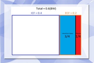 This document summarizes key concepts related to body fluid compartments, osmotic pressure, and synaptic transmission in physiology. It discusses that total body water is 60% of body weight, with intracellular fluid making up 40% and extracellular fluid 20%. Extracellular fluid is further divided into interstitial and plasma sub-compartments. Osmotic pressure is determined by effective osmolytes that cannot cross cell membranes. Synaptic transmission can occur electrically through gap junctions or chemically through neurotransmitters acting on ionotropic or metabotropic receptors. Action potentials are generated by the opening and closing of sodium and potassium ion channels in neurons.