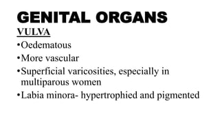 The document summarizes many of the physiological changes that occur in a woman's body during pregnancy. Key changes include enlargement and increased blood flow to the uterus, breasts, kidneys and other organs. The cardiovascular system adapts with increased blood volume and heart rate. Hormonal changes impact metabolism, thyroid and cortisol levels. Other changes involve the skin, respiratory and musculoskeletal systems to accommodate the growing fetus.