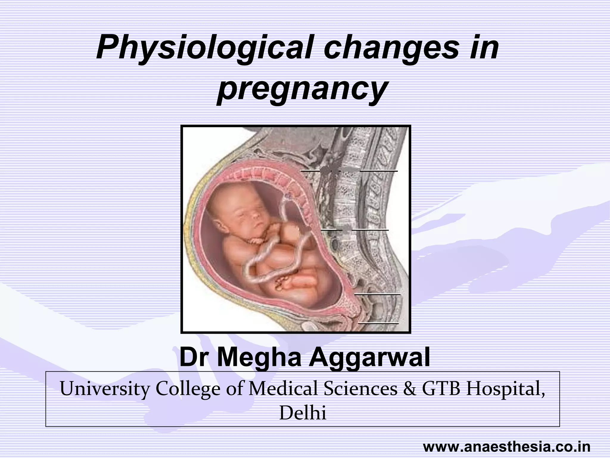 Physiological changes in pregnancy are due to hormonal changes and fetal growth. Systems affected include respiratory (increased lung volumes), cardiovascular (increased cardiac output and stroke volume), hematologic (hemodilution), gastrointestinal (delayed gastric emptying), and renal (increased glomerular filtration rate). These changes result in implications for anesthesia like rapid denitrogenation and hypoxia during apnea due to decreased functional residual capacity. Spinal and epidural requirements are lower due to neural sensitivity changes. Changes revert to pre-pregnancy levels postpartum, generally within 6-12 weeks.
