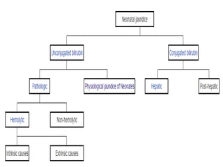 This document discusses physiological jaundice in newborns. It defines jaundice and physiological jaundice as yellowing of the skin due to high bilirubin levels. Physiological jaundice occurs in 50-60% of term babies between days 3-8 due to the immature liver's inability to fully process bilirubin. The document outlines the physiology, causes as fetal red blood cell breakdown and liver immaturity, signs as yellow skin and sclera, and management which may include increased feeding or phototherapy to reduce high bilirubin levels.