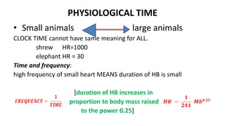 Physiological time differs from real time for animals of different sizes. Smaller animals like shrews have much faster heart rates and metabolize energy at a higher rate than larger animals like elephants. As a result, physiological time passes more quickly for smaller animals, leading to shorter lifespans. While a shrew and elephant may have the same number of heartbeats in their lifetime, the shrew will live only 3 years compared to the elephant's 60 years. At high altitudes, the low barometric pressure reduces oxygen levels and can cause symptoms like weakness, headache, and nausea due to insufficient oxygen delivery to tissues. Acclimatization involves changes to ventilation, oxygen transport and diffusion that help overcome these issues. Phys