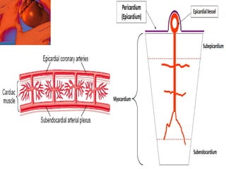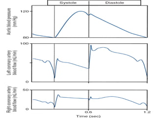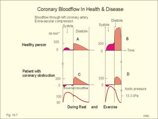 This document discusses coronary circulation and the factors that influence coronary blood flow. It provides details on the physiologic anatomy of the coronary arteries, including their origin, branches, and distribution. It also discusses the normal coronary blood flow and various physical, metabolic, neural, and neurohormonal factors that can impact coronary flow, such as cardiac cycle, aortic pressure, coronary resistance, heart rate, and myocardial metabolism. The document emphasizes the critical role of metabolic factors and how the heart regulates its own blood flow in response to oxygen demand.