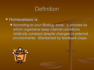 The document discusses several body systems and how they contribute to homeostasis. It explains that homeostasis is the process by which organisms maintain stable internal conditions despite external changes. Negative feedback loops are described as a key mechanism, where a change triggers a response that acts to reverse the change. Several body systems, including the nervous, digestive, urinary, circulatory, respiratory, skeletal, and muscular systems, are discussed in terms of how they utilize feedback loops to keep conditions like temperature, blood sugar, water levels, and more within normal ranges. Diseases that can disrupt homeostasis in each system are also listed.