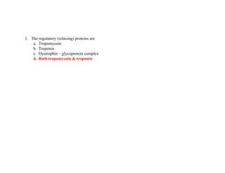 This document contains multiple choice questions (MCQs) about muscle physiology, respiratory system, gastrointestinal system, and kidney physiology. The questions cover topics like muscle contraction, structure and function of respiratory and digestive systems, kidney filtration, reabsorption in nephron segments, and countercurrent mechanisms.