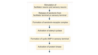 The document discusses learning as the acquisition of new information that alters behavior, classified into non-associative (habituation and sensitization) and associative learning. It also covers memory, defined as the ability to recall past experiences, detailing mechanisms of memory storage, facilitation, habituation, and the transition from short-term to long-term memory. Additionally, it addresses memory-related conditions like amnesia and Alzheimer's disease.