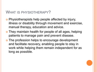 The document provides an overview of physiotherapy, detailing its purpose, methods, and various types of equipment used in practice. Physiotherapists aid individuals recovering from injuries or managing illnesses using a whole-person approach centered on patient participation. It highlights essential equipment such as exercise bikes, treatment tables, and ultrasound machines, emphasizing quality and suitable choices for a professional rehabilitation setting.