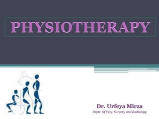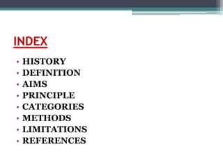 The document discusses various aspects of physiotherapy, including its history, definition, aims, principles, categories, and methods. Physiotherapy originated in ancient times but was established as a modern science in the 19th century due to injuries sustained in World War 2. It aims to restore function and mobility through physical means without the use of drugs, using methods like heat therapy, massage, hydrotherapy, exercise and electricity.