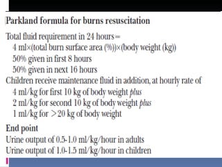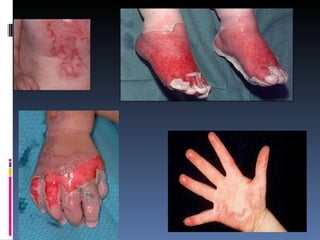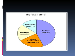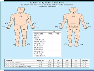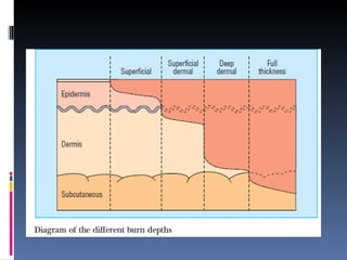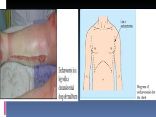 Physiotherapy plays an important role in the management of burn injuries. It focuses on positioning, splinting, and scar management to prevent contractures and promote wound healing. Positioning aims to maintain joints in functional positions opposite to the direction of potential contracture. Splinting is used during the acute inflammatory phase and following skin grafting to maintain positioning. Physiotherapy also addresses scar management through pressure therapy, stretching, and exercises to improve range of motion and function.
