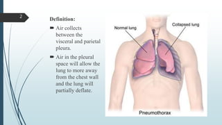 Pneumothorax occurs when air collects in the pleural space, causing the lung to collapse, with types including spontaneous and traumatic. Clinical symptoms often involve sudden chest pain and breathlessness, while diagnosis can be confirmed through chest X-rays. Treatment varies based on the size of the pneumothorax, ranging from observation to procedures like needle aspiration, drainage, or surgery for recurrent cases.