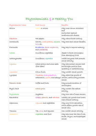 This document lists various phytochemicals found in foods and their potential health benefits. It discusses phytochemicals like allicin in garlic and onions that may lower cholesterol and protect against cardiovascular disease, as well as capsaicin in hot peppers that may reduce blood clotting. Additionally, it mentions carotenoids in foods like carrots and kale that may have anti-cancer benefits, and flavinoids in berries that may help improve memory. Overall, the document outlines different phytochemicals and their presence in foods, linking several to potential anti-cancer and heart-health promoting effects.