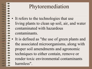 Phytoremediation utilizes living plants to clean contaminated soil, air, and water, offering a cost-effective and environmentally friendly approach to remediation. The technique involves various processes like phytoextraction, rhizodegradation, and phytodegradation, targeting heavy metals and organic pollutants. While effective in certain applications, it requires long-term commitment and faces limitations such as susceptibility to soil toxicity and potential bioaccumulation of contaminants.