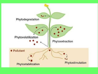 Phytoremediation uses plants to remove pollutants from soil and water. Plants can uptake and concentrate metals and organic compounds in their roots and biomass (phytoextraction), transform contaminants into less toxic forms (phytotransformation), or stabilize pollutants through root sorption and prevention of mobility (phytostabilization). The mechanisms depend on the contaminant type and soil properties. Phytoremediation can be an effective, low-cost in situ technique for cleaning contaminated sites.