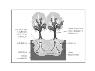 Phytoremediation uses plants to remove contaminants from soil or water. It is a more environmentally friendly and cost-effective alternative to excavating and disposing of contaminated material elsewhere. Various phytoremediation processes include phytoextraction, which uses plants to remove contaminants from soil into harvestable biomass, phytostabilization which stabilizes contaminants in soil near roots, and phytotransformation which transforms contaminants via plant metabolism. Genetic engineering can enhance natural phytoremediation capabilities.