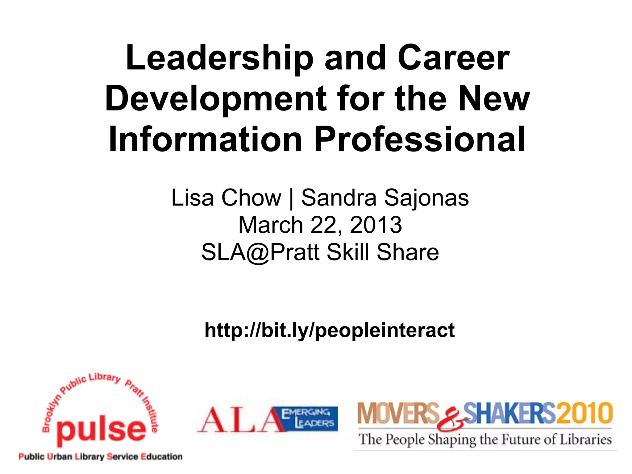 This document provides tips and strategies for information professionals to develop their leadership skills and careers. It recommends conducting a self-assessment to identify strengths, weaknesses, opportunities, and threats, as well as setting 1, 2, and 5 year career goals. Additional tips include connecting with colleagues, finding mentors, getting involved in professional organizations, maintaining an online presence, attending conferences, keeping skills updated, regularly updating resumes/CVs, and stepping outside one's comfort zone. Resources are also provided.