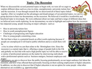 The document discusses a group's decision to create a documentary about the recession and its impacts on young people. Some of the topics they plan to explore are the rise in university tuition fees, increased youth unemployment, challenges of pursuing higher education, and higher crime rates. The group believes the recession has led to interlinked issues like unemployment, public unrest, and increased crime. They aim to interview professionals and investigate how the public feels about the recession's personal impacts, such as on employment and education prospects, and what alternatives exist besides higher education.