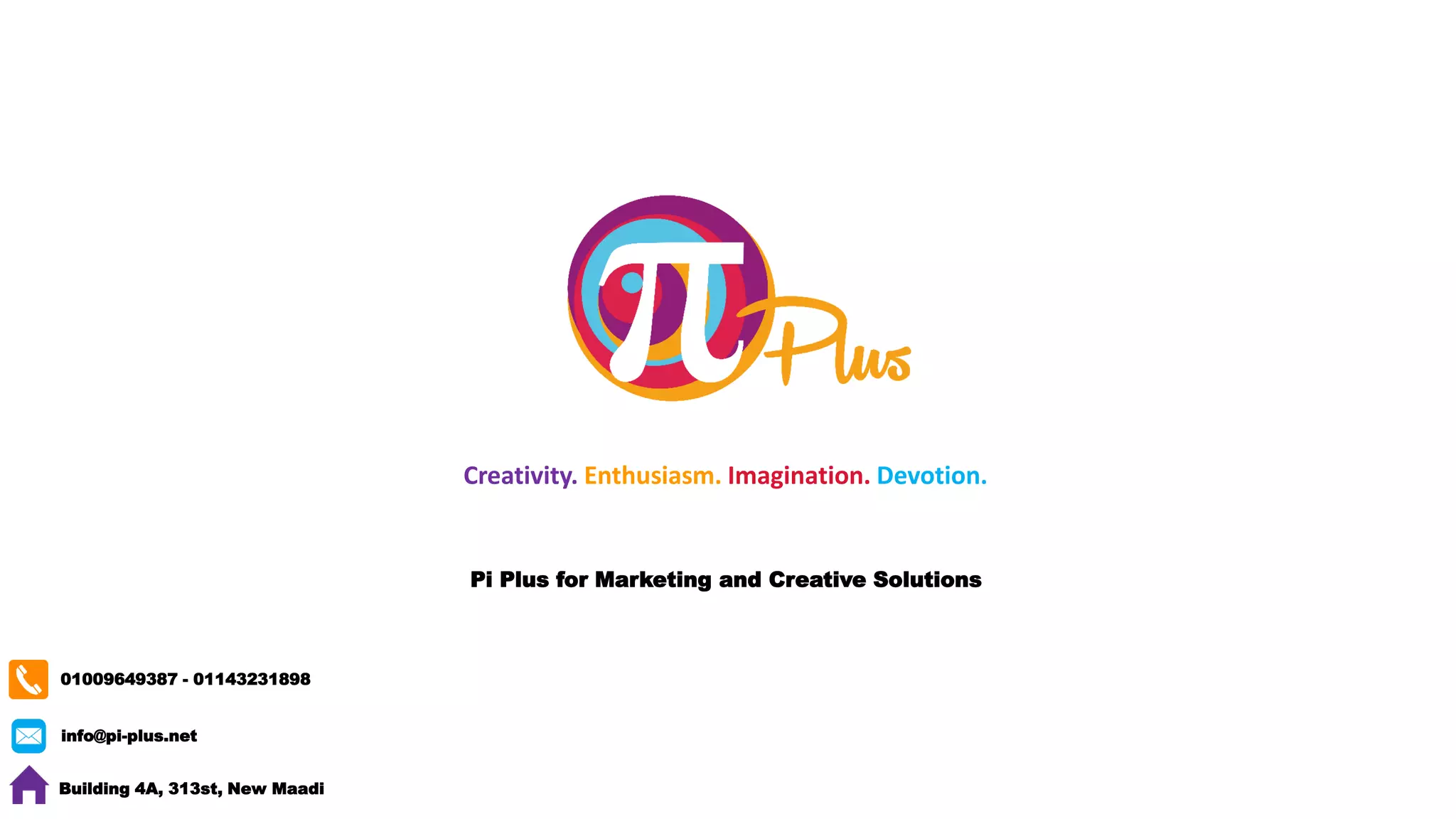 Pi Plus is a marketing and creative solutions agency in Egypt that utilizes modern and guerrilla marketing strategies to transform business concepts. Their vision emphasizes creativity and uniqueness, likening their potential to the infinite possibilities represented by the mathematical concept of pi. The agency offers a range of services including digital marketing, design, events, and brand identity to help businesses attract and retain customers.