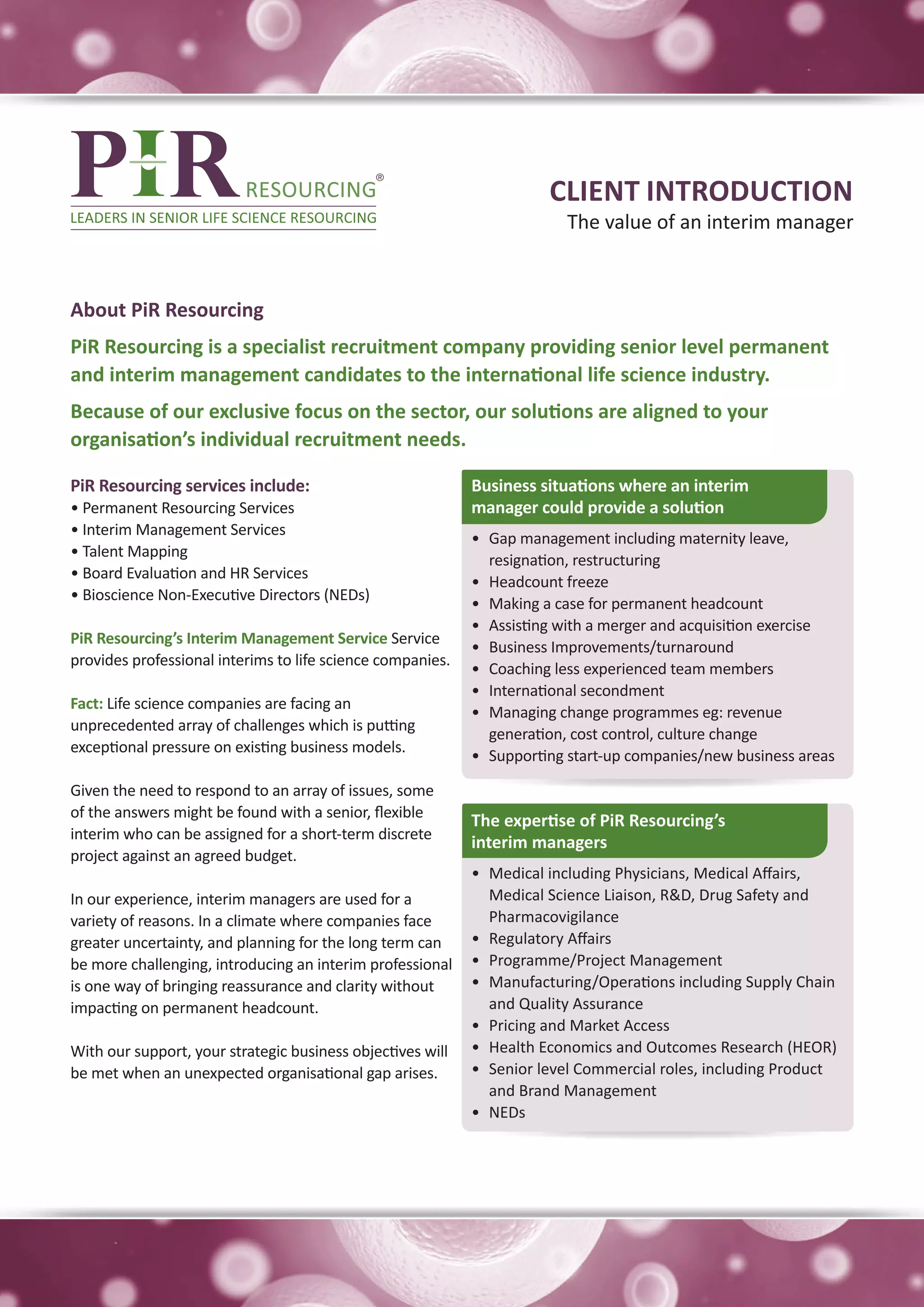 PiR Resourcing is a specialist recruitment firm that provides interim management candidates to the life sciences industry. They offer interim managers for various business needs like filling gaps, turnarounds, and projects. Their interim managers have medical, regulatory, commercial, and other expertise. PiR handles the entire process of identifying qualified candidates, interviewing, contracting, and supporting both the client and interim manager throughout the assignment. Their interim managers are experienced professionals capable of achieving the client's objectives on a project basis.