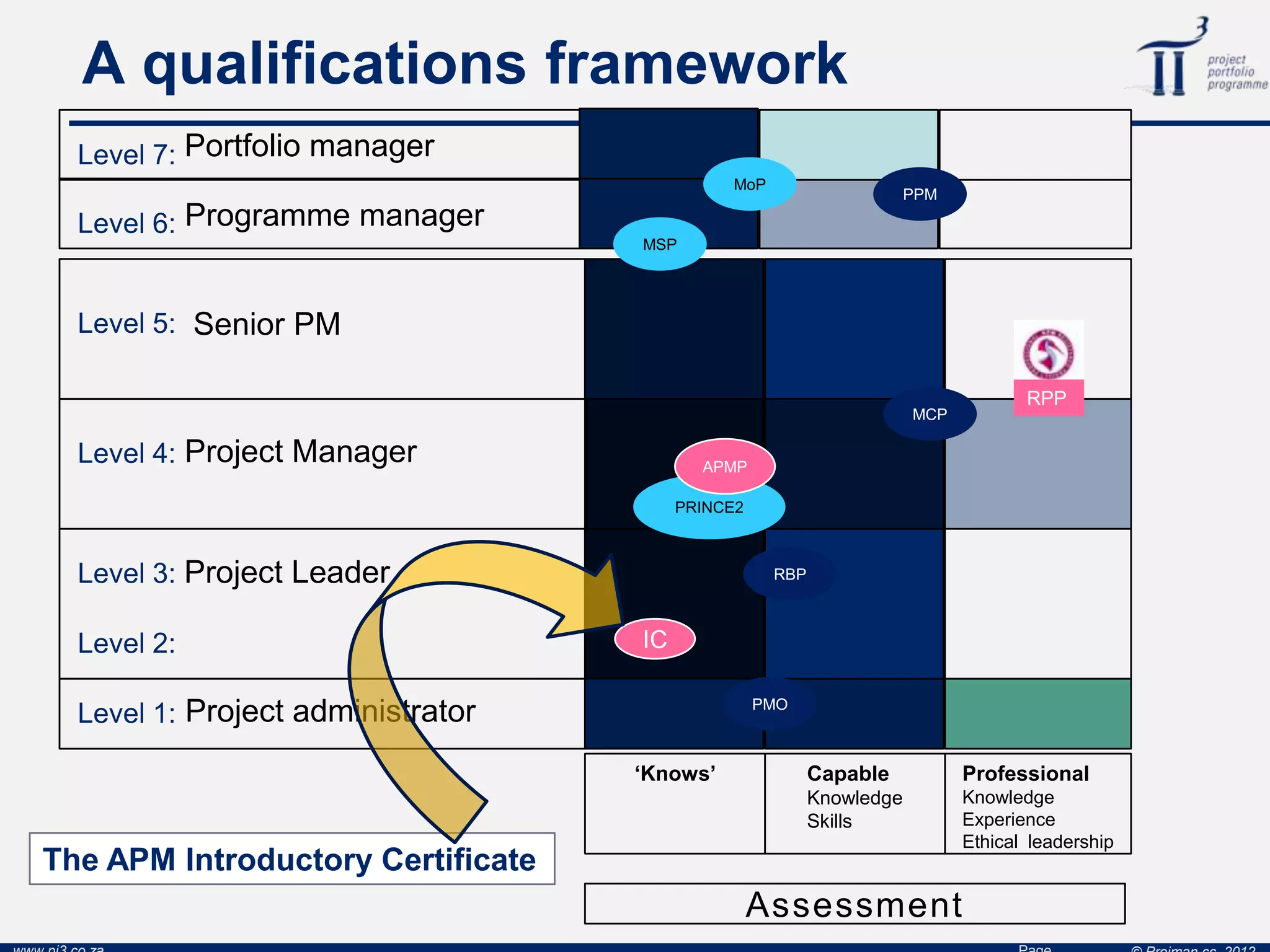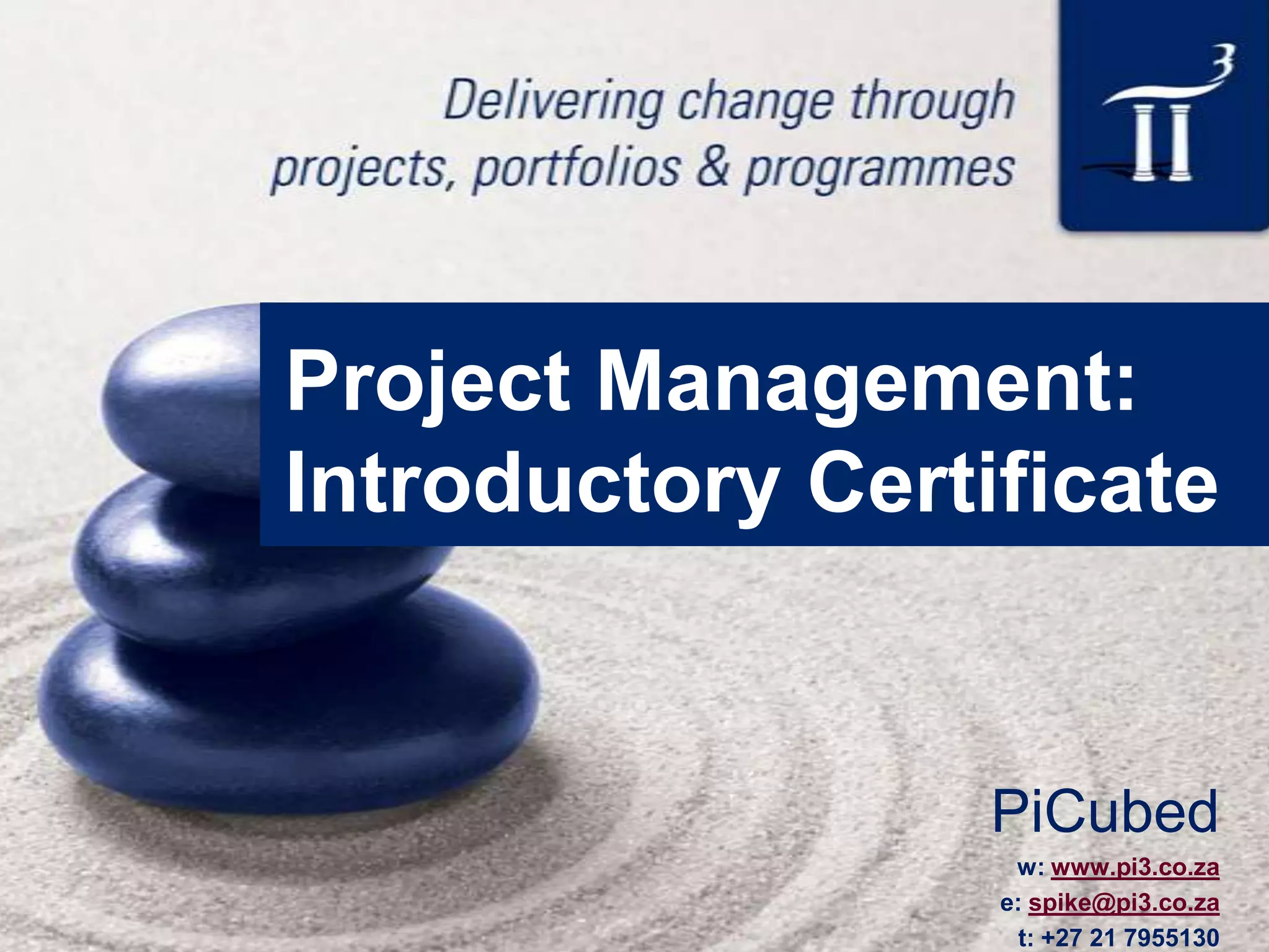 The document provides information about project management qualifications from the Association for Project Management (APM) in the UK. It outlines three main qualifications - the Introductory Certificate (IC), the APMP, and the Practitioner Qualification (PQ). The IC offers a broad understanding of project management principles and is assessed via a multiple choice exam. The APMP demonstrates knowledge across all project management elements and is internationally recognized. The PQ assesses 30 competencies over a 3-day residential center. It also provides contact information for the PiCubed training company that delivers courses for these qualifications.