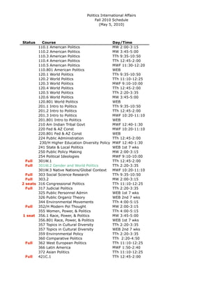 This document contains the course schedule for the Politics International Affairs department for Fall 2010. It lists over 60 courses in American politics, world politics, political theory, and public administration offered between May 2010 and December 2010. The courses are listed with their status (full, seats available), course number, title, and meeting days/times. Both in-person and online web-based courses are included.