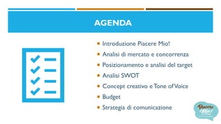 Il documento presenta il lancio del nuovo brand 'Piacere Mio!', una linea di piatti pronti surgelati, enfatizzando qualità, praticità ed ecosostenibilità. Si analizzano il mercato, i concorrenti e si delineano strategie di comunicazione mirate a famiglie e lavoratori, mettendo in evidenza la velocità di preparazione e l'italianità delle ricette. Il brand si propone di soddisfare la crescente domanda di piatti pronti, combinando tradizione e innovazione, con un impegno verso l'ambiente.