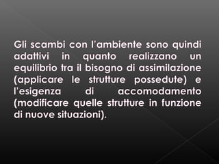 Il documento esplora le teorie di Jean Piaget riguardanti lo sviluppo cognitivo nei bambini, evidenziando l'importanza del costruttivismo dove il bambino è visto come un attivo costruttore delle proprie conoscenze tramite interazioni con l'ambiente. L'opera di Piaget si concentra sulle fasi dello sviluppo mentale, caratterizzate da schemi di assimilazione e accomodamento, e propone un approccio scientifico basato su osservazioni e quasi-esperimenti. Viene discusso anche il rifiuto delle teorie innatiste e ambientaliste, presentando la teoria organismica e sottolineando che l'intelligenza si sviluppa in base ai bisogni e alle esperienze di ciascun individuo.