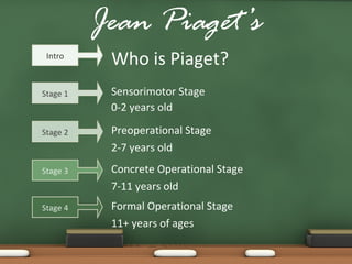 Jean Piaget was a Swiss psychologist who developed a theory of cognitive development in children. His theory proposes that children progress through four distinct stages as their mental abilities develop: sensorimotor (birth to age 2), preoperational (ages 2 to 7), concrete operational (ages 7 to 11), and formal operational (ages 11 to adulthood). At each stage, children develop new cognitive abilities that allow for more complex understanding and logical thought. Piaget's theory has been influential in the field of education by shifting focus to how children learn and think at different ages.