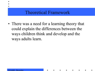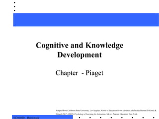 The document discusses the cognitive development theories of Jean Piaget and Lev Vygotsky, highlighting the differences in how they conceptualize learning and knowledge acquisition in children. Piaget's theory emphasizes genetic epistemology, developmental stages, and the roles of assimilation and accommodation in cognitive growth, while Vygotsky's theory stresses the importance of social interactions and cultural tools in development. Key concepts include Piaget’s stages of development and Vygotsky’s zone of proximal development, both underscoring the complexities of learning processes.