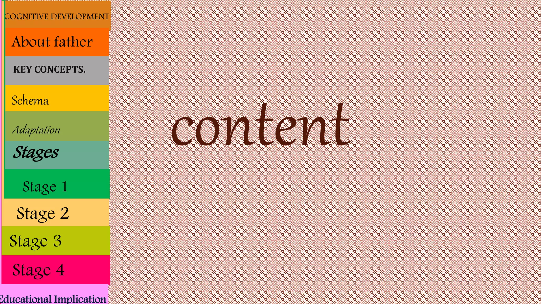 This document discusses Jean Piaget's theory of cognitive development. It outlines the key concepts of Piaget's theory, including schemas, assimilation, accommodation, and adaptation. It then describes the four stages of cognitive development according to Piaget: the sensorimotor stage from birth to age 2, the preoperational stage from ages 2 to 7, the concrete operational stage from ages 7 to 11, and the formal operational stage from age 11 onward. It concludes by discussing some educational implications of Piaget's theory, such as providing concrete materials and hands-on activities to stimulate cognitive growth.