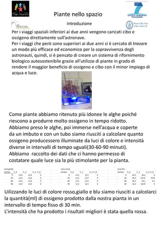 Il documento discute l'importanza delle piante, in particolare delle alghe, per la creazione di un sistema di rifornimento biologico autosostenibile per i viaggi spaziali oltre i due anni. Attraverso esperimenti con diverse luci, è stato misurato l'ossigeno prodotto dalle alghe, evidenziando che la luce rossa ha dato i risultati migliori. Questo approccio potrebbe ridurre la necessità di rifornimenti di cibo e ossigeno durante le missioni spaziali prolungate.