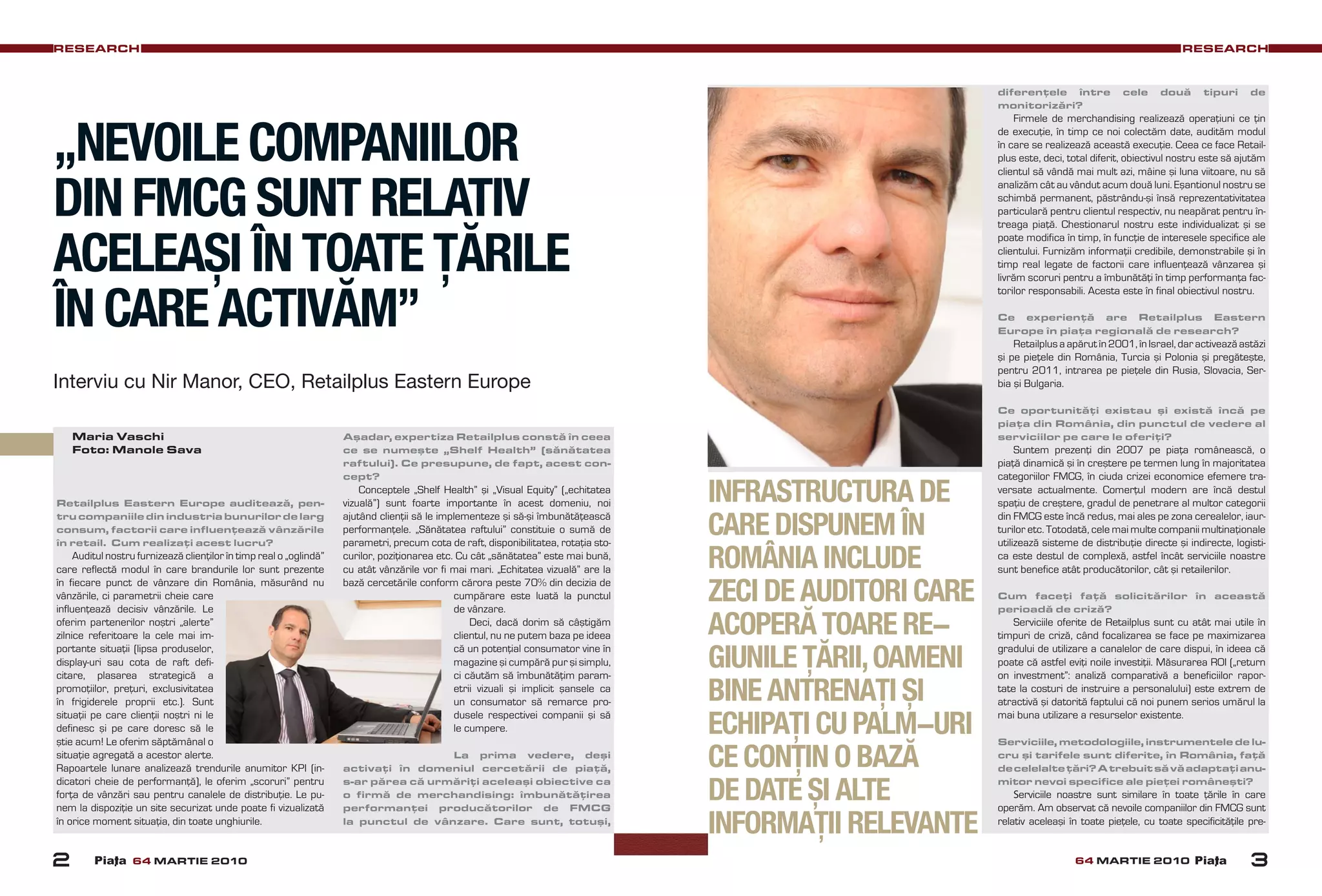 RetailPlus Eastern Europe oferă servicii de monitorizare care ajută companiile FMCG să îmbunătățească vânzările prin colectarea de date în timp real despre parametrii care influențează aceste vânzări, cum ar fi 'shelf health' și 'visual equity'. Compania, activă pe piața românească din 2007 și pe alte piețe din Europa, utilizează o metodologie adaptată specific pentru fiecare client, oferind rapoarte detaliate și sugestii pentru îmbunătățirea performanței. RetailPlus se diferențiază de alte firme prin livrarea de informații credibile și relevante, axate pe factorii care impactează vânzările, și prin actualizarea constantă a datelor.