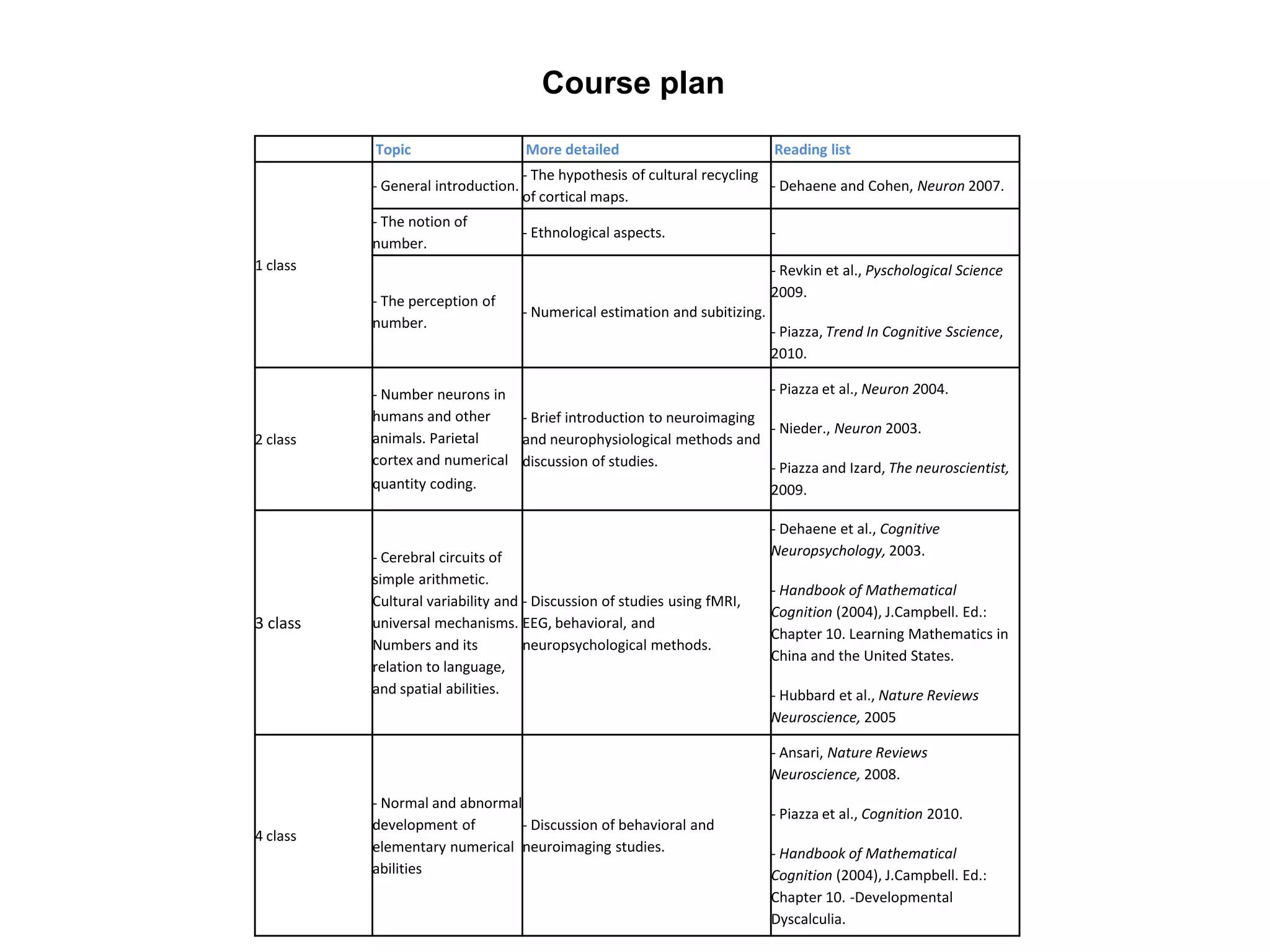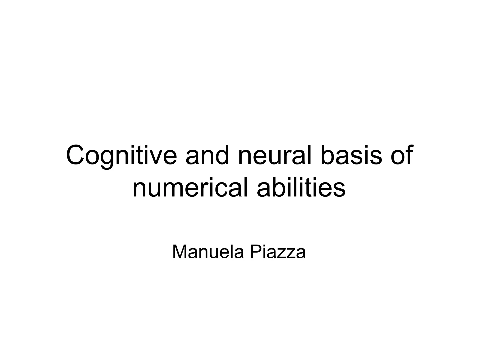 This document outlines a course on the cognitive and neural basis of numerical abilities. The course will cover topics such as the perception and representation of numerical quantity in the brain, number neurons in humans and other animals, and the cerebral circuits underlying simple arithmetic. It will also discuss cultural variability and universal mechanisms in numerical cognition, as well as how numbers relate to other domains like language and space. Each class will include more detailed discussion of relevant studies using methods like fMRI, EEG, and behavioral experiments.