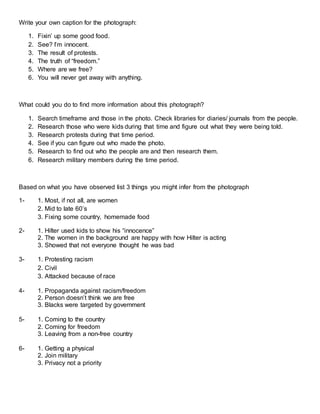 The document discusses a series of 6 photographs and asks questions to analyze each one. It asks who is in each photo, what the situation portrays, what message the photographer intended to convey, why each photo is historically important, what questions it raises, potential captions, and inferences that can be made. The photos depict old women cooking, Hitler with a child, police attacking civil rights protesters, a man hanging from the Statue of Liberty, immigrants arriving in the US, and military physical exams.
