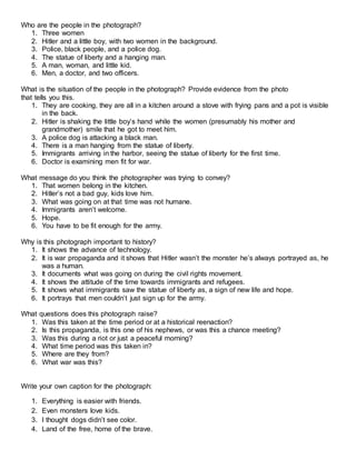The document appears to be analyzing six different historical photographs by asking a series of questions to determine the subjects, context, message, and significance of each photo. For each photo, the questions probe who is pictured, what the situation depicts, what the photographer intended to convey, why it is important historically, what questions it raises, possible captions, how to learn more about it, and inferences that can be drawn from its content.