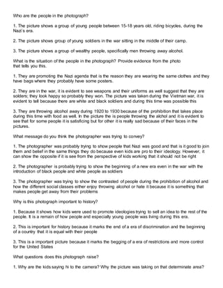 The document discusses a photograph showing either a group of young people promoting the Nazi agenda on bicycles in Germany during World War II, a mixed-race group of soldiers from the Vietnam War sitting in their camp, or wealthy individuals throwing away alcohol during American Prohibition in the 1920s-1930s. The photographer was likely trying to convey either support for Nazi ideology, mark racial integration in the military, or contrast social attitudes towards prohibitions. The photograph provides historical evidence of its time period and raises questions about the captured scene and people.