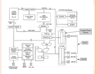 The document provides an introduction to PIC microcontrollers. It discusses that PIC stands for Programmable Intelligent Computer and is a microcontroller with built-in memory, RAM, and modules like EEPROM and timers. PICs are popular due to their low cost, availability of development tools, small instruction set, and small size. The document outlines the different PIC architectures, families, speeds, and memory sizes. It provides details on the registers, peripherals like flash memory, RAM, EEPROM, I/O ports, and USART serial communication.