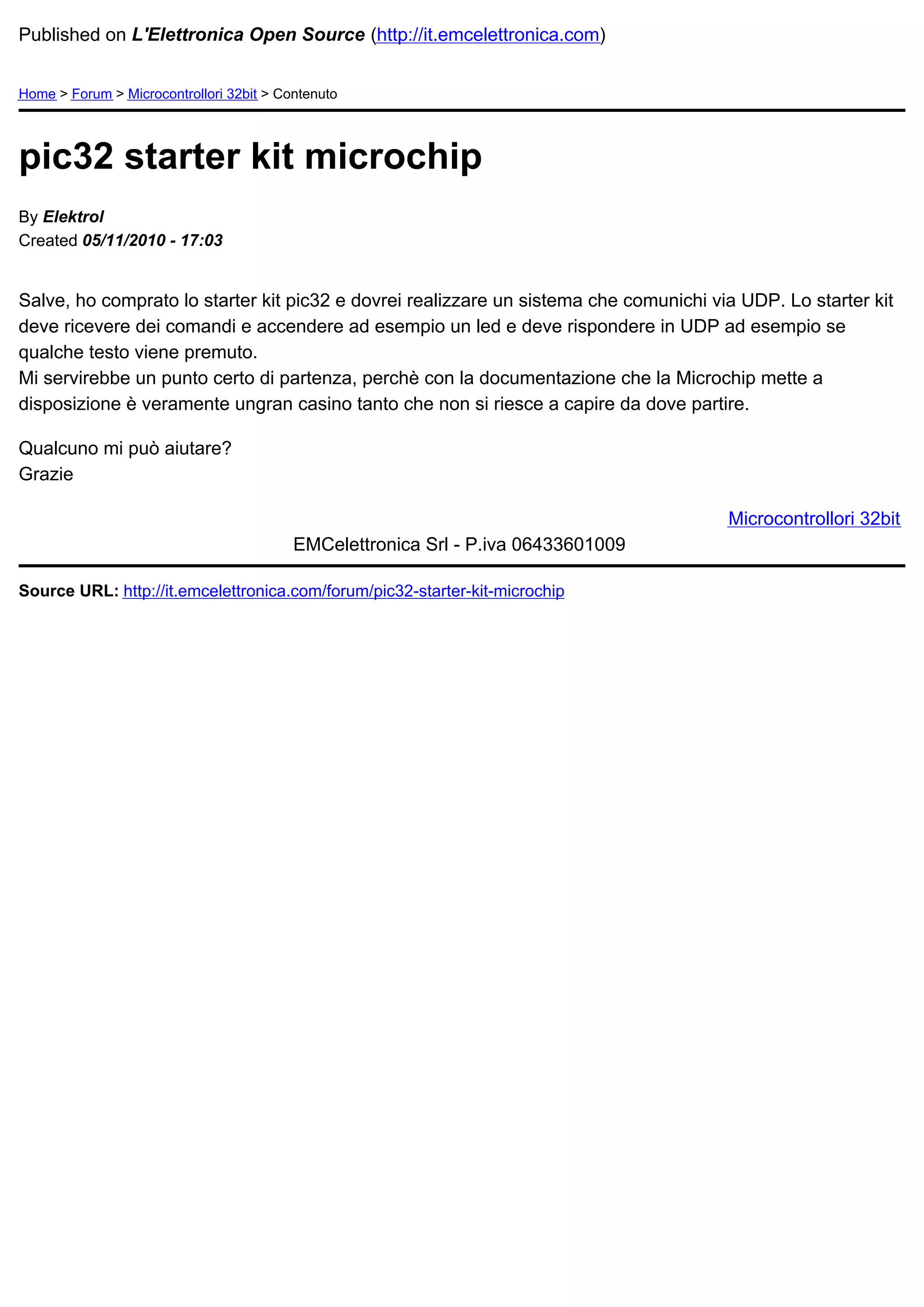 Un utente cerca assistenza per realizzare un sistema di comunicazione UDP utilizzando lo starter kit PIC32 di Microchip. Esprime frustrazione per la complessità della documentazione disponibile e richiede un punto di partenza chiaro per il suo progetto. Il documento è un post su un forum di elettronica open source.