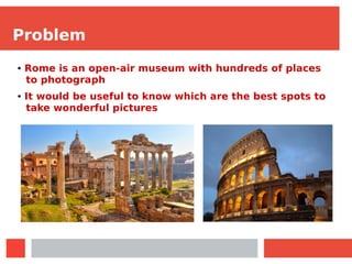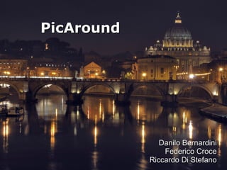 PicAround is an app that maps photo hot spots in Rome based on where users have taken pictures. The app notifies users when approaching a hot spot proportional to its popularity and the user's distance. It also integrates with social networks to view the best photos taken at each location and allow users to share their own photos.
