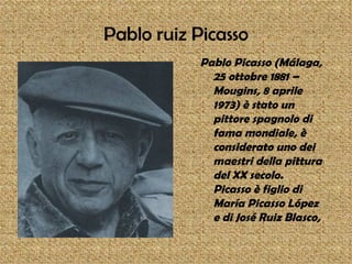 Pablo Picasso, nato a Málaga nel 1881, è uno dei più influenti pittori del XX secolo, noto per la sua capacità di evolvere artistica durante la sua vita. Dopo esperienze formative in Spagna, si trasferisce a Parigi nel 1904, dove svilupperà il suo stile innovativo, esplorando diverse correnti artistiche. Tra le sue opere più celebri si annoverano 'Guernica', 'Les Demoiselles d'Avignon' e 'La Tragedia', che riflettono la sua visione unica della realtà e dell'arte.