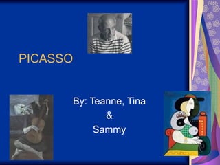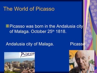 Picasso was born in Malaga, Spain in 1881. He was influenced by his father, who was a drawing teacher. When Picasso went to Paris in 1900, he was influenced by the impressionist, abstract, and unique styles of other artists at the time. Between 1901-1904, Picasso's paintings were predominantly blue, known as his blue period. With cubism, Picasso and Braque transformed the way objects were represented in pictures. Picasso was supported early in his career, though his art was controversial among some critics. Picasso had a huge influence and is considered one of the most important artists of the 20th century.