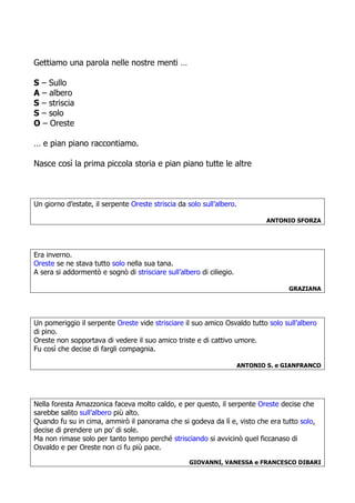 Il documento descrive un progetto di gemellaggio tra classi di scuole primarie in Italia e Spagna, incentrato sull'invenzione di storie basate sulla tecnica del 'sasso nello stagno' di Gianni Rodari. Diverse piccole storie scritte dagli alunni coinvolgono avventure del serpente Oreste e dei suoi amici in vari scenari. L'iniziativa, oltre a sviluppare la creatività, celebra la collaborazione tra giovani scrittori.