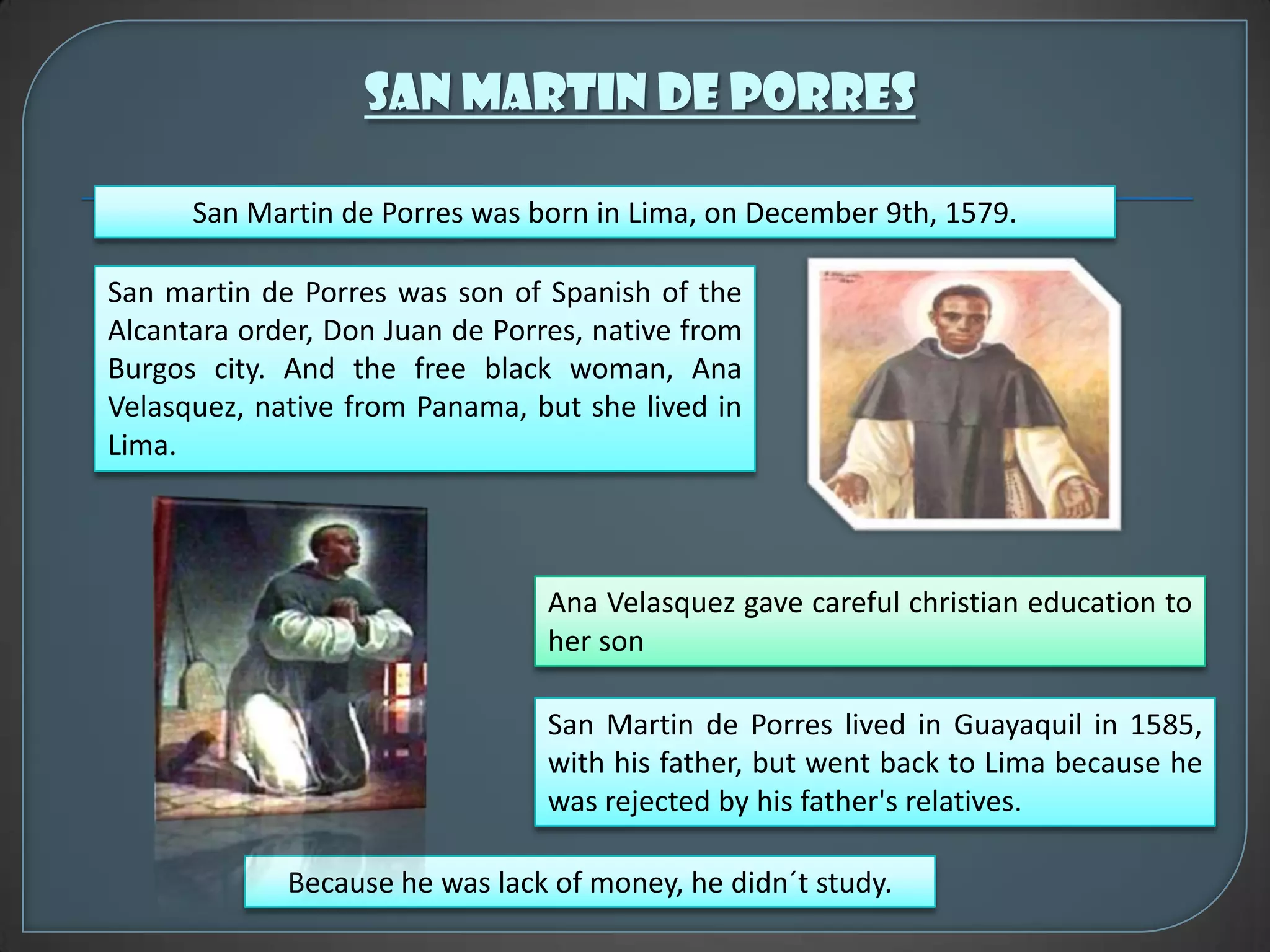 San Martin de Porres was born in 1579 in Lima, Peru to a Spanish nobleman and a freed black slave woman. He received a Christian education from his mother and entered the Dominican order in 1594, where he worked as a surgeon, barber, and clothes collector, caring for the poor and teaching Christianity. He was attributed with supernatural powers like controlling plants and animals as well as bilocation. When he died in 1639, he began to be venerated and was canonized as the patron saint of social justice in 1962 by Pope John XXIII.