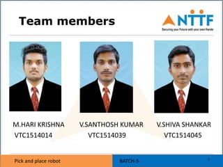 This document describes the design of an automatic pick and place robot created by students. The robot uses a robotic arm with a gripper to pick objects from one box and place them in another box moving along linear guide ways. It analyzes how the robot can increase productivity over manual labor by working faster and without breaks. Diagrams and descriptions explain the mechanical and electrical components of the robot including the lead screw, ball bearings, gripper, manipulator, power supply, and PIC microcontroller used to control the robotic movements.