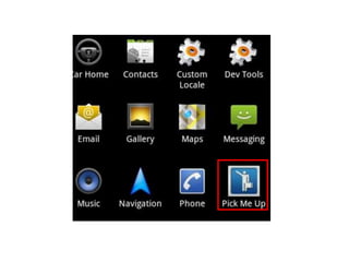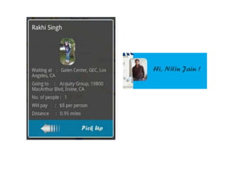 An Android app called Pick Me Up allows drivers and passengers going on short journeys to connect for carpooling. The app uses social media integration and geolocation to make carpooling more usable and trustworthy. Drivers can search for passengers going in their direction within a specified radius based on distance or money. Passengers get notified when selected by a driver. User testing found people liked features like social login, quick profiles, and location autocomplete while suggestions included alternative views, easier search changes, and payment integration.